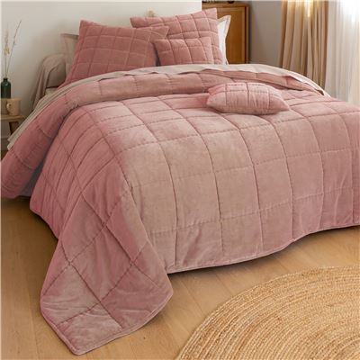 édredon : Sorte de courtepointe décorative, garnie et piquée (pour conserver un garnissage uniforme) qui recouvre uniquement le plateau du lit. Il est plus léger qu'une couette et rehausse le décor de la chambre.