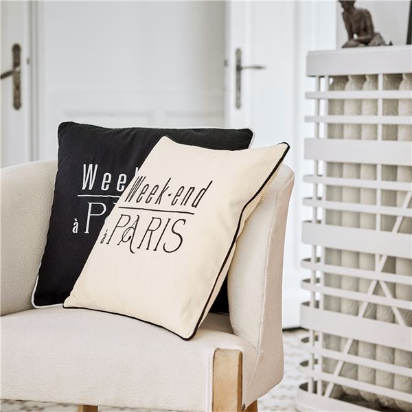 Fan de Paris et envie d'une touche de chic dans votre déco ? Choisissez ce coussin brodé "week-end à Paris" ! Un élégant coussin idéal pour habiller votre canapé, votre fauteuil ou votre lit. Il s'accorde parfaitement avec tous les styles de décoration, du plus classique au plus moderne, et apporte une note de raffinement et de romantisme à votre pièce. Il est également parfait pour offrir à vos amis ou à votre famille, qui apprécieront ce cadeau original et tendance ! Brodé en lettres élégantes, ce coussin est rehaussé d'un biais contrastant, qui lui donne du relief et du caractère. Il est déhoussable pour le lavage.