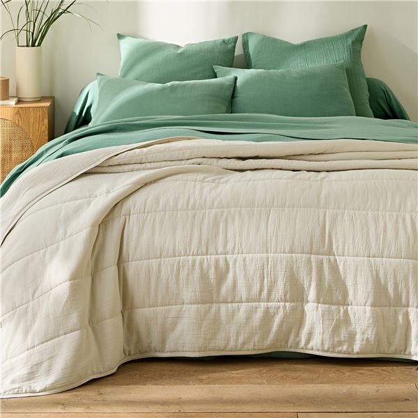 Profitez d'une agréable sensation de légèreté avec ce jeté de lit en gaze de coton ! Vous allez adorer sa douceur et son moelleux. Son piquage lignes lui donne un style sobre qui s'intègre à tous les décors, et son garnissage léger vous offre juste ce qu'il faut de chaleur. Un jeté tout doux idéal aussi sur un canapé, et disponible en taille édredon, une touche raffinée à installer au bout du lit par exemple.