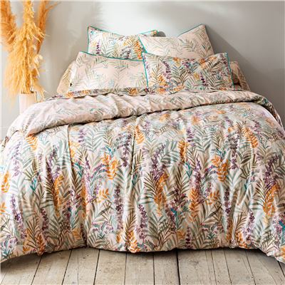 - Motif principal feuillage multicolore : drap plat, recto des taies d'oreiller, recto de la housse de couette.