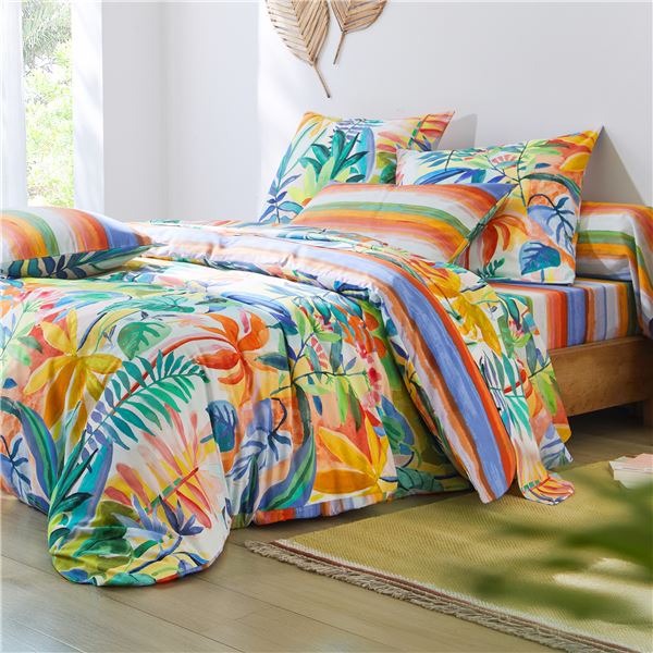- Motif principal fleurs et feuilles tropicales : drap plat, recto des taies d'oreiller, recto de la housse de couette.