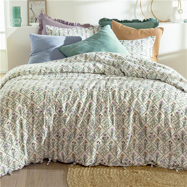 Le charme réside dans les détails. Retrouvez ce motif délicat sur la housse de couette, sublimée par des finitions nouettes raffinées à la base, et sur les taies (carrée ou rectangulaire) dotées d'un petit volant de 3 cm. Laissez-vous séduire par l'élégance intemporelle de cet imprimé façon herbier !