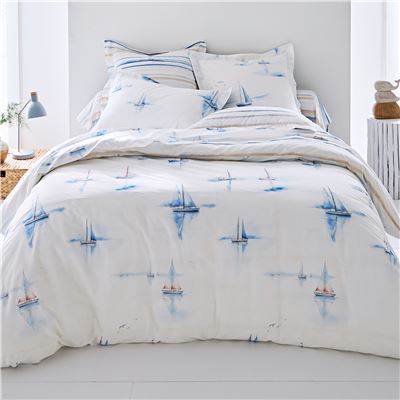 - Motif principal voiliers sur fond blanc : drap plat, recto des taies d'oreiller et de la housse de couette.