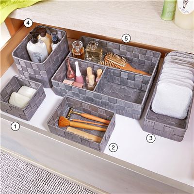 Organisez votre rangement avec ces paniers tressés organiseurs de tiroir très pratiques au quotidien. Les petits paniers ont des tailles différentes et permettent de créer un rangement sur mesure à vos besoins, à vos tiroirs. Les paniers en métal et polyester sont parfaits en guise de rangement de sous-vêtements, d'accessoires, de foulards, de la papeterie, du maquillage... Du bureau à la salle de bains, les paniers tressés sont le rangement petit prix et malin. Avec une structure métallique et un tressage en tissu robuste, les paniers sont très résistants à l'usage. Composez alors le rangement de votre tiroir avec efficacité !