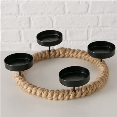 Illuminez vos soirées avec ce photophore couronne au style naturel. Sa structure en jute tressée apporte une touche chaleureuse, et ses 4 coupelles en métal noir ajoutent une note de modernité. Idéal en décoration de table, ce photophore original peut accueillir 4 bougies (non livrées). C'est l'accessoire parfait pour un centre de table qui se distingue, il crée une atmosphère conviviale et lumineuse lors de vos repas.