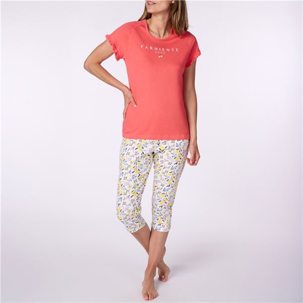 Adoptez un look pétillant et profitez d'une sensation de légèreté absolue avec ce pyjama corsaire pour femme. Sa maille jersey fluide, composée d'un mélange coton et modal, offre une douceur soyeuse et une souplesse incomparable, idéale pour des nuits fraîches et confortables. Le haut uni corail affiche fièrement un message "Farniente" accompagné d'un petit motif citron, invitant à la détente. Il est sublimé par des manches courtes volantées qui ajoutent une touche de fantaisie. Le pantalon corsaire, avec son imprimé floral et citronné sur fond blanc, possède une coupe 3/4 moderne et une ceinture élastique pour un bien-être total.