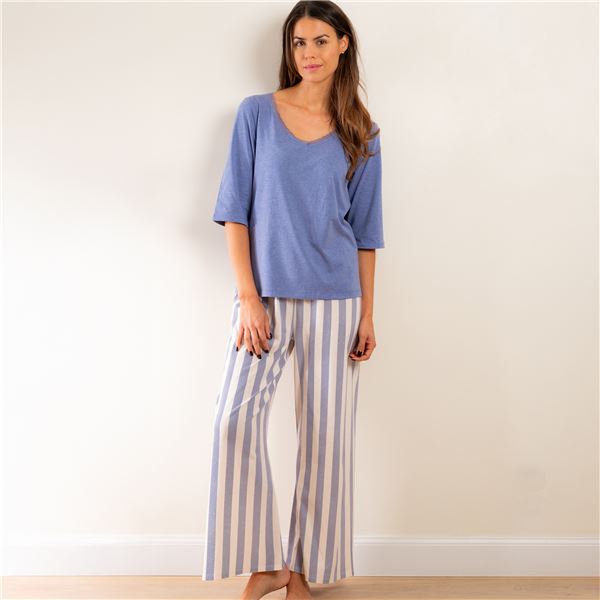 Apportez une touche d'élégance bord de mer à vos moments de repos avec ce pyjama long pour femme signé Becquet. Confectionné dans une maille jersey 100% coton légère et respirante, il offre un confort absolu tout au long de l'année. Le haut uni bleu chiné se distingue par ses manches 3/4 et son col rond féminin, souligné par une délicate bordure en dentelle au décolleté. Il s'accorde parfaitement au pantalon droit à rayures marine, doté d'une taille élastique avec nouettes pour un ajustement sur mesure. Un ensemble raffiné qui combine bien-être et style intemporel.
