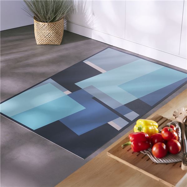 Sublimez votre décoration avec ce tapis en vinyle au design graphique contemporain. Bien plus qu'un simple ornement, il offre une protection robuste contre les chocs et les éclaboussures dans votre cuisine ou salle de bain. Ses motifs géométriques bleus apportent une touche de modernité dynamique à vos entrées ou vérandas, tout en sécurisant vos passages grâce à sa surface antidérapante.